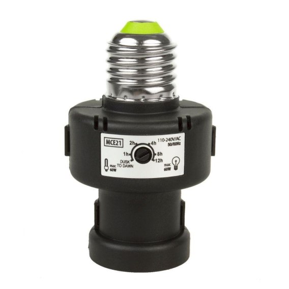 Informacje dodatkowe: Napięcie pracy: 110-240V AC / 50-60 Hz, Maksymalne obciążenie: żarówka tradycyjna 100W, żarówka energooszczędna 60W (E27), Czułość oświetlenia: <5-15 LUX, Wbudowany timer: AUTO, 1, 2, 4, 8, lub 12h, Temperatura pracy: -20 ~ +40 °C, Wilgotność pracy: <93 ? RH, Stopień ochrony: IP20, Typ gwintu: E27, Średnica: 50mm, Wysokość z gwintem: 90mm